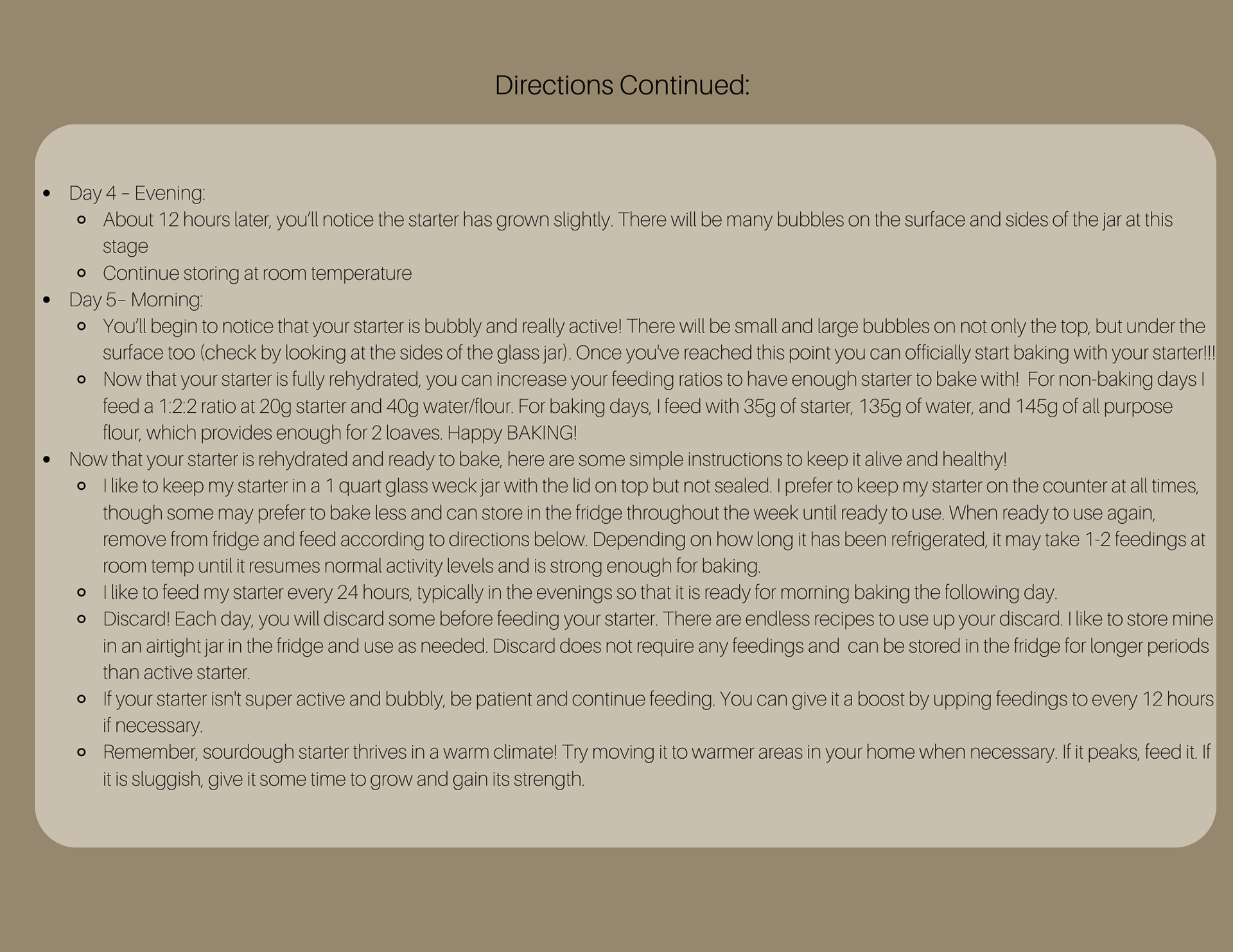 Below you will find the 5 day instructions to fully rehydrate your oak + ollie sourdough starter! feel free to print them for easy access. As always, reach out to us on instagram @oakandollieco if you have any questions and happy baking!